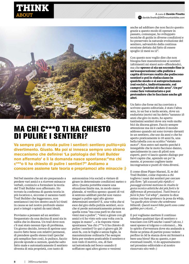 Proviamo a pensare ad un sentiero frequentato da una decina di anni sia in salita che in discesa. Un trail dove non c’è mai stato nessun tipo di problema. Un giorno decido di metterci mano pesantemente, invece di aprirne uno nuovo fatto bene con relativi permessi. Prendo quel trail perché è più semplice fare così: lo pulisco un po’, faccio piccole sponde a cazzum, qualche salto con rampa che scalcia più di un puledro in calore e automaticamente il sentiero diventa di mia proprietà, con tanto di autonomina (via social) a vietare di girare in determinate condizioni meteo o altro. Questa potrebbe essere una situazione limite ma, in modo meno plateale, si verifica spesso: quanti di voi si sentono additati perché non vanno magari a pulire ogni alto giorno determinati sentieri? E, una volta che si esce dal giro della pulizia sentieri, ecco che si perde automaticamente potere su quella zona:”ma cosa parli te che non vieni mai a pulire”, “vieni a girare con gli amici e ti ho visto solo una volta con la zappa in mano”… e la risposta viene spontanea:”ma chi c***o ti ha chiesto di pulire i sentieri?“