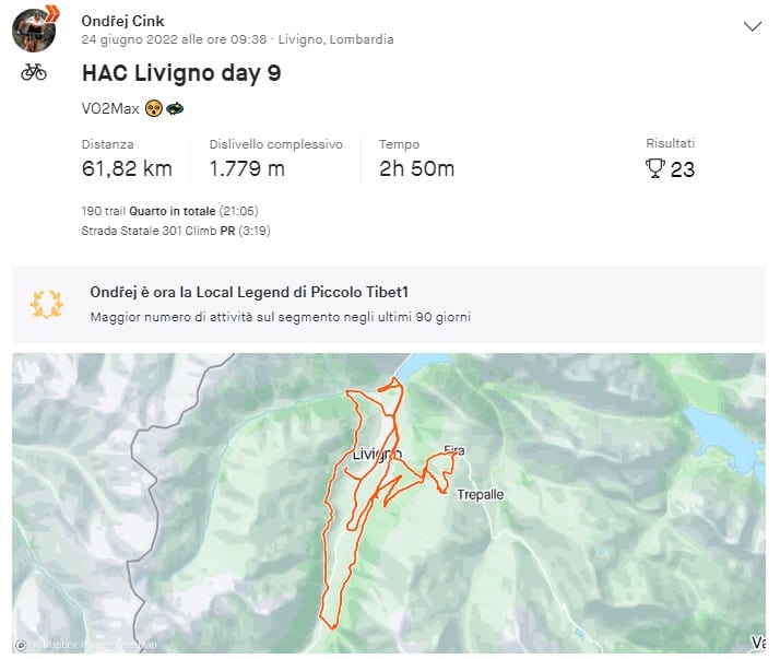 Ondrej Cink ha effettuato 15 giorni in altura percorrendo circa 1000km per 48h di lavoro e 24.340m di dislivello! C’è da sottolineare che il ceco sta lavorando molto di qualità (con tanti lavori di cambio di ritmo) e ha portato con se solo la MTB (non la bici da strada) quindi per forza di cose i kilometraggi non possono essere esagerati come sulla bici da strada.