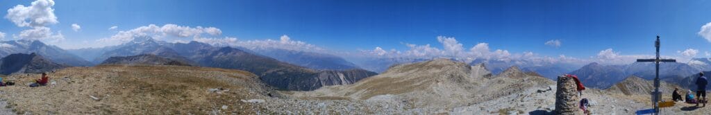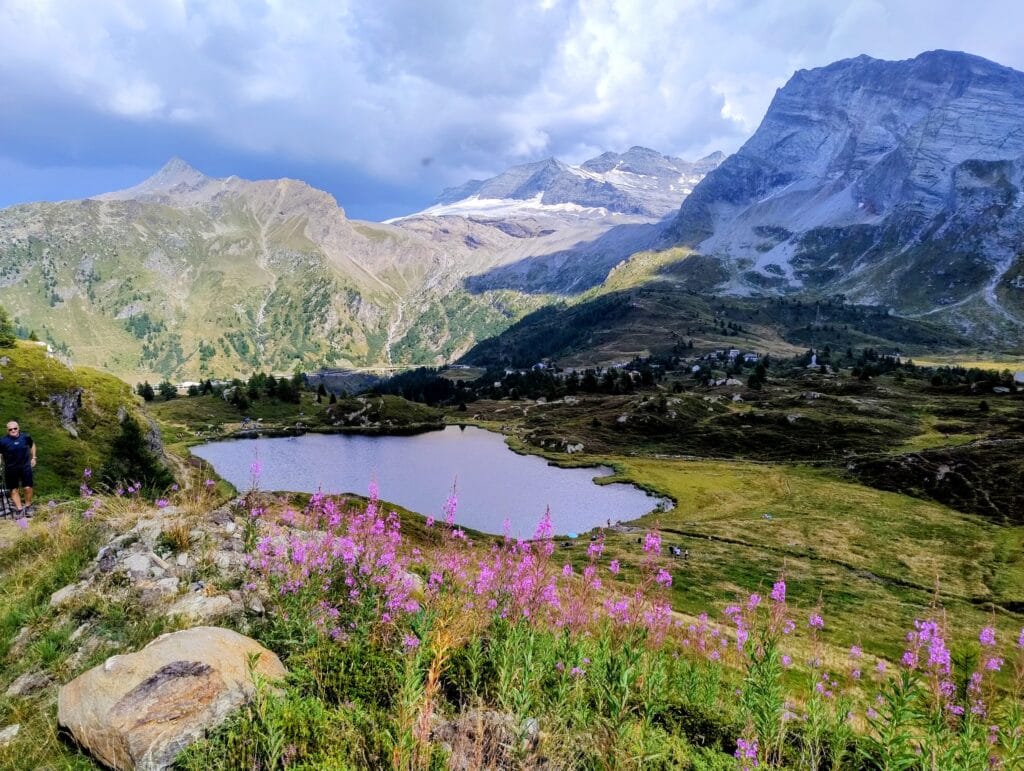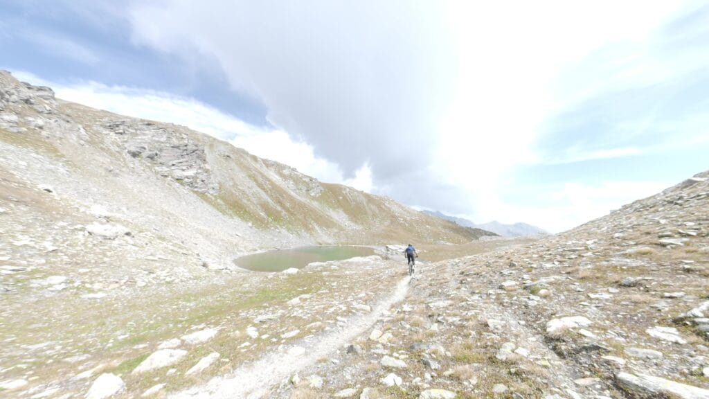 Dall’alto, il panorama è semplicemente indescrivibile: un mare di cime alpine, silenzio assoluto e la sensazione di trovarsi sospesi tra cielo e terra. Le possibilità in discesa sono molteplici: si può tornare dalla via di salita, scendere verso il Bistine Pass, oppure lanciarsi in una cavalcata epica di oltre 2.000 metri di dislivello fino a Briga. Trail naturali, tecnici, ma sempre guidabili con un ottimo ritmo, per chi ama il vero spirito della mountain bike alpina.