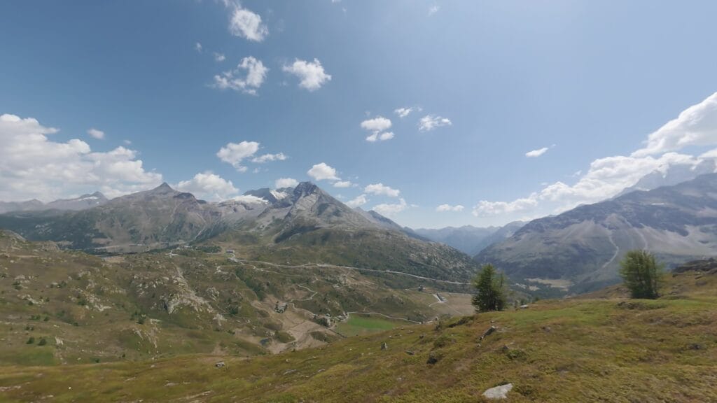 Tra i percorsi esplorati, il primo è stato il giro che passa dal Bistine Pass, aggira il Galehorn e torna poi nella piana del Sempione attraverso una discesa a tratti quasi proibitiva in sella. La salita al passo è il cuore di questo itinerario: una rampa diretta, visibile da lontano, con pendenze che oscillano tra il 15 e il 17%. Una sfida vera, che porta a quota 2.400 metri, dove la montagna si apre in un vallone più dolce.