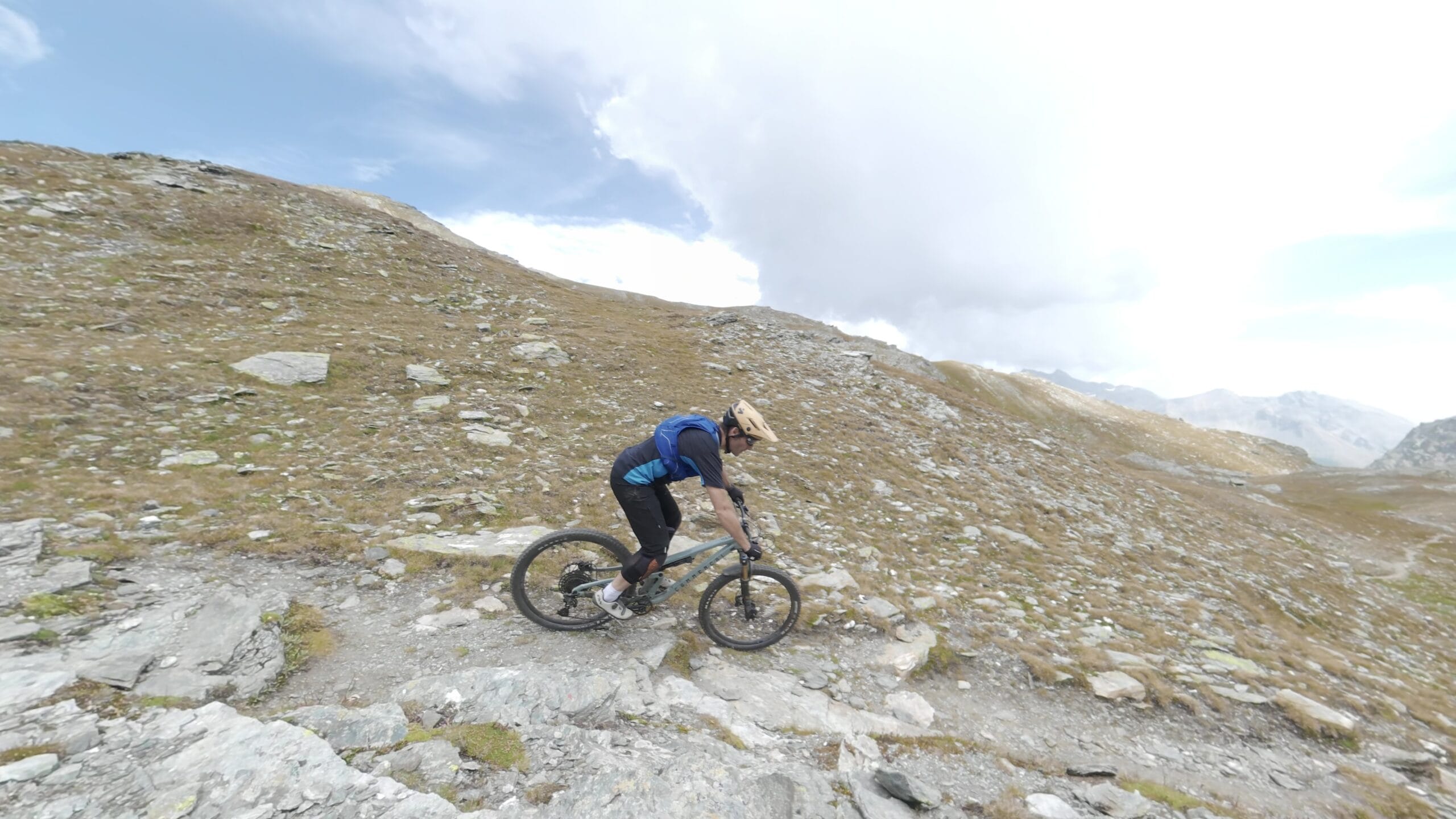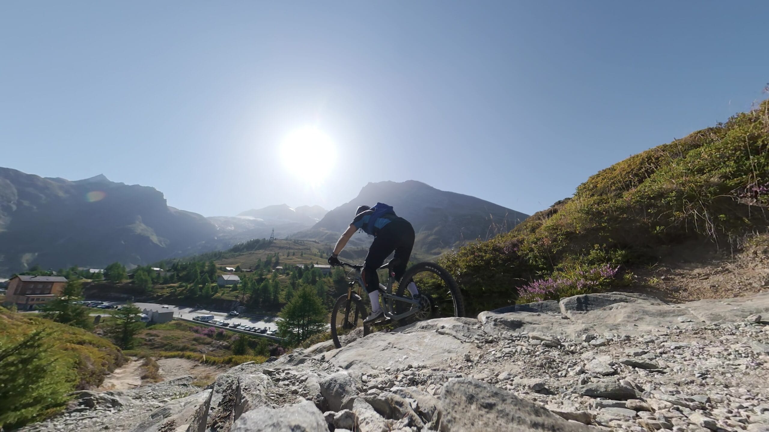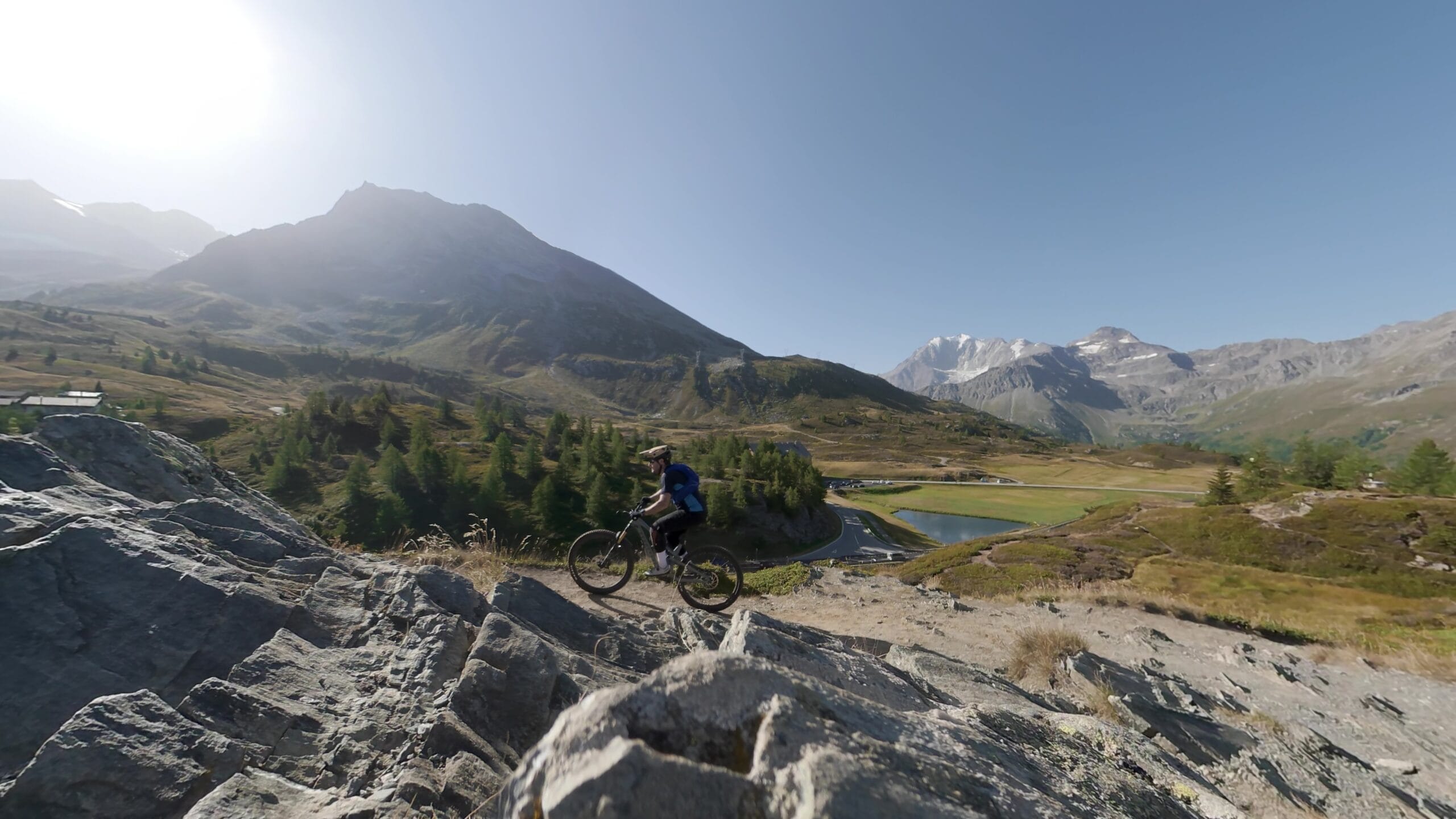 Dall’alto, il panorama è semplicemente indescrivibile: un mare di cime alpine, silenzio assoluto e la sensazione di trovarsi sospesi tra cielo e terra. Le possibilità in discesa sono molteplici: si può tornare dalla via di salita, scendere verso il Bistine Pass, oppure lanciarsi in una cavalcata epica di oltre 2.000 metri di dislivello fino a Briga. Trail naturali, tecnici, ma sempre guidabili con un ottimo ritmo, per chi ama il vero spirito della mountain bike alpina.