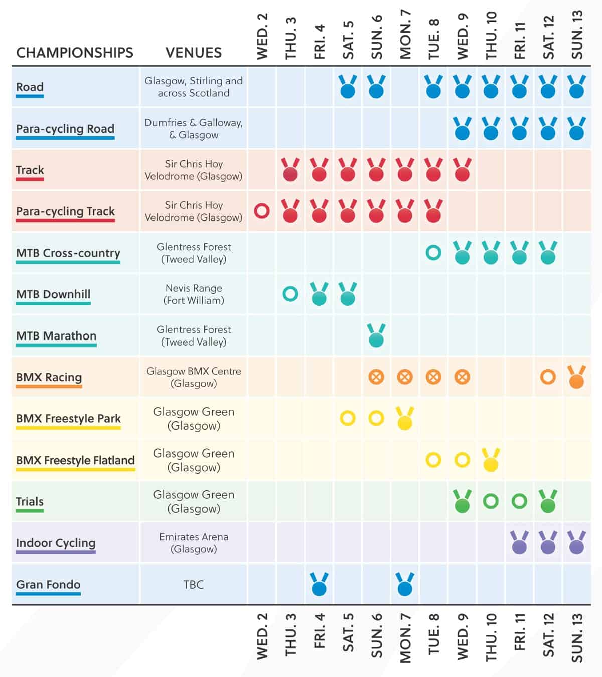 Un programma ricchissimo di eventi dal 3 al 13 agosto: tutta la Scozia è impegnata ad ospitare i mondiali su strada, paralimpici, pista, fuoristrada, trial, bmx e addittura Indoor Cycling! Fort William è la sede dei Campionati del Mondo di DH mentre, Marathon e Cross Country, si terranno a Glentress, nella Tweed Valley, nota per aver ospitato eventi di enduro nelle ultime stagioni.