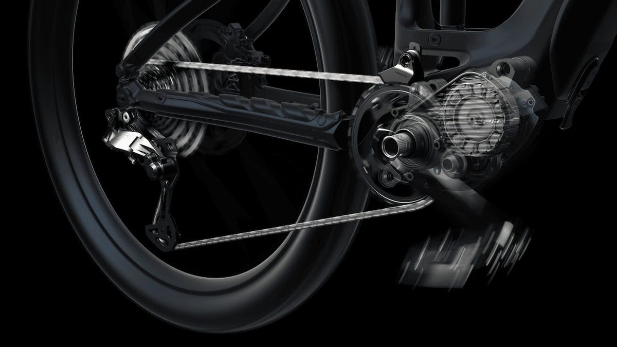 Funzionamento: quando si cambia, il sistema Di2 richiede all’unità di azionamento EP di far avanzare la trasmissione sulla corona ed effettuare così cambi di marcia fluidi e senza pedalare. Per la gioia dei noleggiatori di bici e dei principianti, i quali spesso in turbo trovano difficoltà a fare cambiate dignitose.