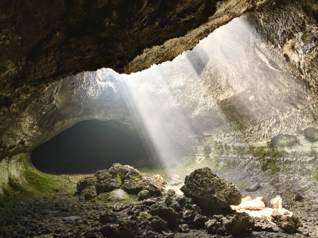 La parte più spettacolare della grotta ha subìto diversi crolli, aprendo una finestra che incornicia il cielo. É da qui che entra la luce, è da qui che il sole irradia la roccia vulcanica che ora smette di essere scura per regalarci sfumature di verde e di giallo.
