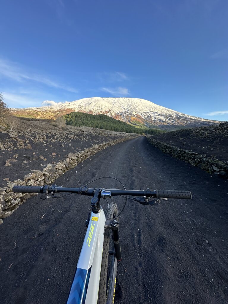 L’Etna ci regala sprazzi di colore, ma è il nero a dominare. Nero che qui fa il paio con terreno vulcanico, il quale a sua volta fa il paio con single track.