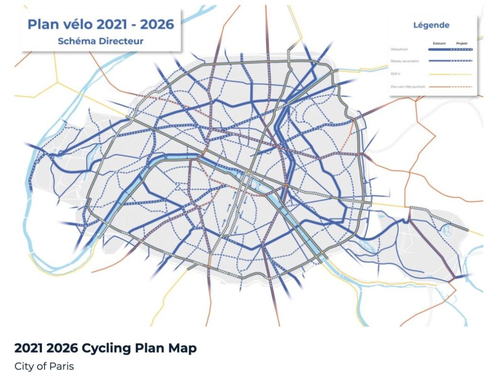 L’obiettivo dei funzionari di Parigi è rendere più facile e sicuro l’attraversamento in bicicletta della città. Il Plan Velo: Act 2 prevede di ampliare di ulteriori 130 km le piste ciclabili già presenti, trasformare le “coronapistes” (realizzate in piena pandemia per limitare la capienza dei mezzi pubblici) in piste ciclabili permanenti, sviluppare tutti gli assi ciclabili di Parigi, da quelli metropolitani a quelli regionali, dare continuità alla rete sviluppata dai comuni limitrofi, installazione di semafori, che daranno priorità a bus, tram e biciclette, e messa in sicurezza degli incroci prendendo spunto da modelli già presenti in altri paesi, come ad esempio l’Olanda.