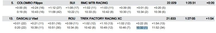 Filippo Colombo (Team BMC) è autore di una partenza straordinaria dove mette in fila tutto il gruppo, ma già finito il giro di lancio è autore di una foratura che lo rimbalza oltre il 40° posto. Inizia così la rimonta di Filippo Colombo che nel 3° giro fa segnare il miglior tempo dell’intera gara: 10’22”! Solo grazie a questo giro si riporta a ridosso nella top10. Nei successivi giri continua a menare come un fabbro, facendo segnare ancora il miglior tempo nel corso del 6° giro.
