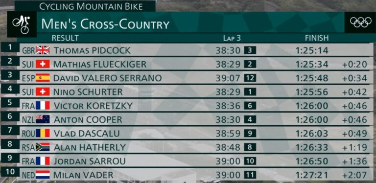 Tom Pidcock è medaglia d’oro! Secondo Mathias Fluckiger e 3° David Serrano, che toglie a Nino Schurter la medaglia di bronzo.