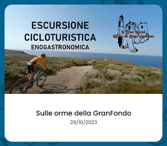 Il 29 Ottobre andrà in scena la 1ª edizione della GRANFONDO DI MTB con annessa ESCURSIONE, una pedalata alla scoperta delle bellezze dell’Isola che prevede alcune soste gastronomiche con degustazione dei prodotti locali.