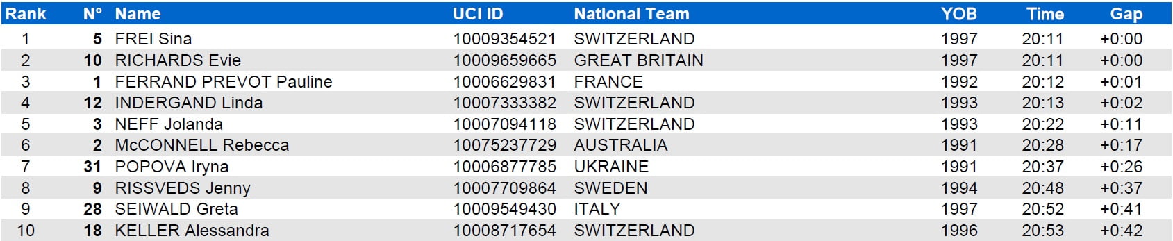 Frei ha sfruttato le sue doti di scalatrice per aprire un piccolo ma importante gap, mentre alle sue spalle una generosissima Evie Richards (“ho speso troppo nei primi giri, come al solito,” ammetterà in conferenza stampa) si lanciava in un inseguimento a perdifiato fino al riaggancio avvenuto proprio all’ultima curva. La britannica ha tentato di uscire dalla svizzera lanciata in volata, ma la sua rimonta si è fermata a pochi centimetri dalla medaglia d’oro. Medaglia di bronzo per Pauline Ferrand-Prevot, la cui accelerazione nel penultimo giro non è riuscita a creare distanza fra sé e le rivali.