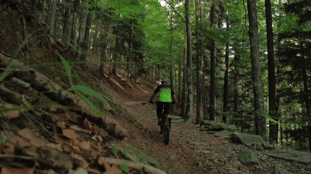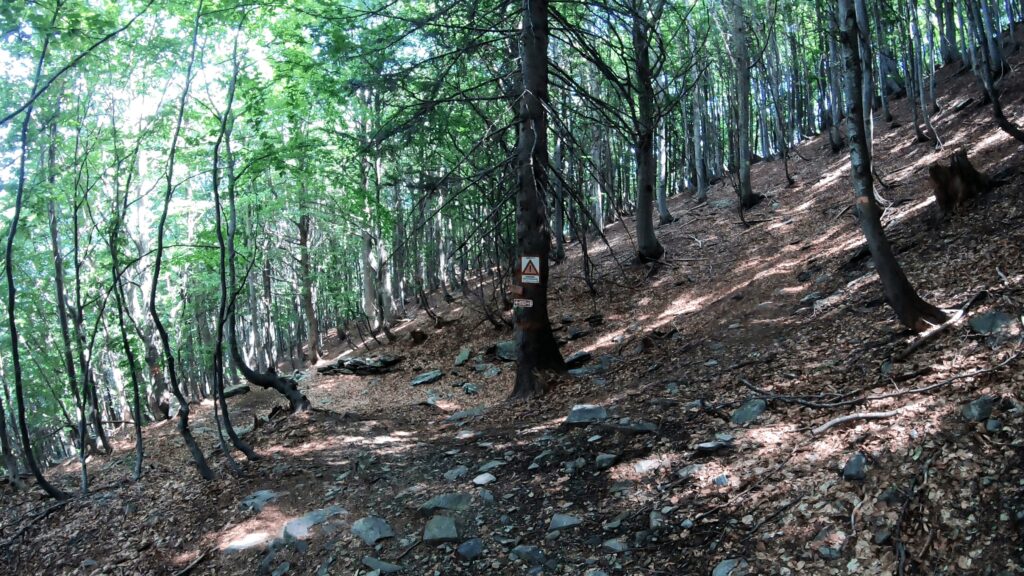 Il tragitto prosegue lungo un sentiero in cui a tratti è necessario scendere dalla bici. L’inizio della discesa non è ben segnalato, un cartello che inviata a proseguire con prudenza segna lo start di questa discesa.