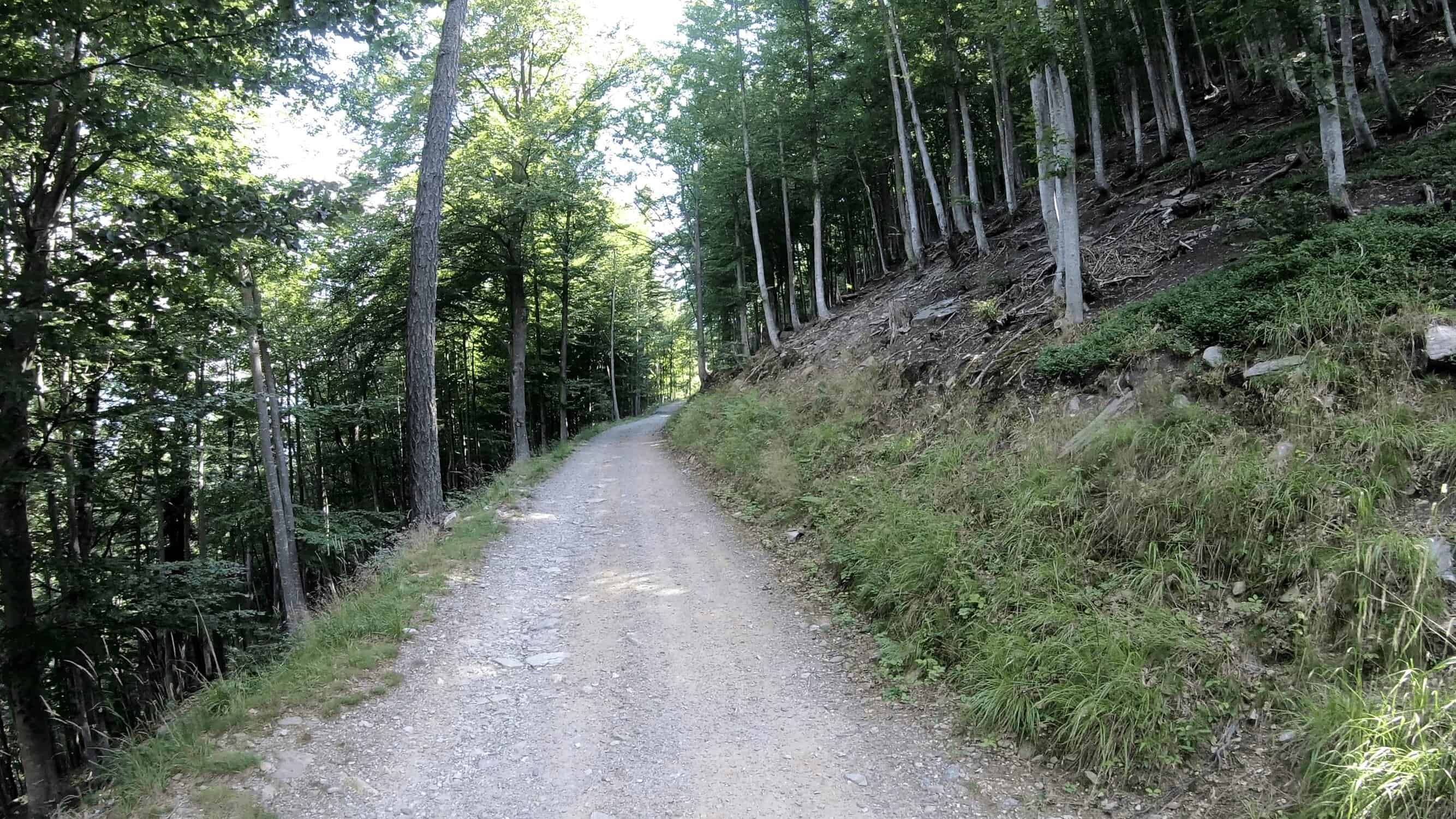 Il tragitto prosegue lungo un sentiero in cui a tratti è necessario scendere dalla bici. L’inizio della discesa non è ben segnalato, un cartello che inviata a proseguire con prudenza segna lo start di questa discesa.