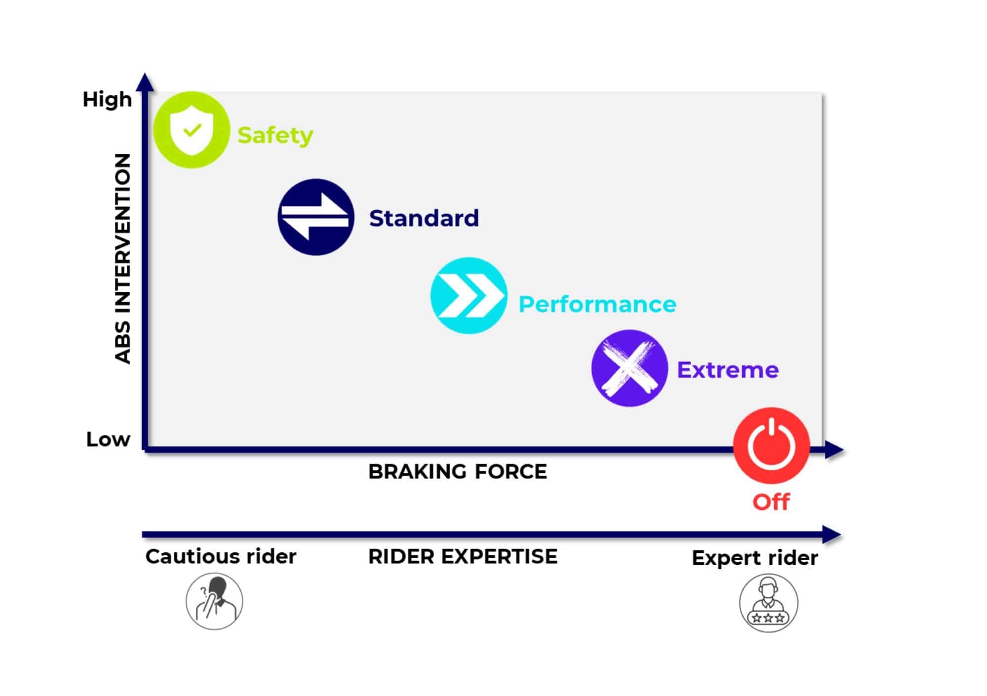 Blubrake ha sviluppato quattro modalità con cui l’ABS può entrare in funzione. Gli stessi produttori di e-bike possono scegliere come configurare l’ABS oppure possono lasciare la scelta al proprietario della bici, che potrà scegliere tra diverse opportunità direttamente tramite il display della e-bike.