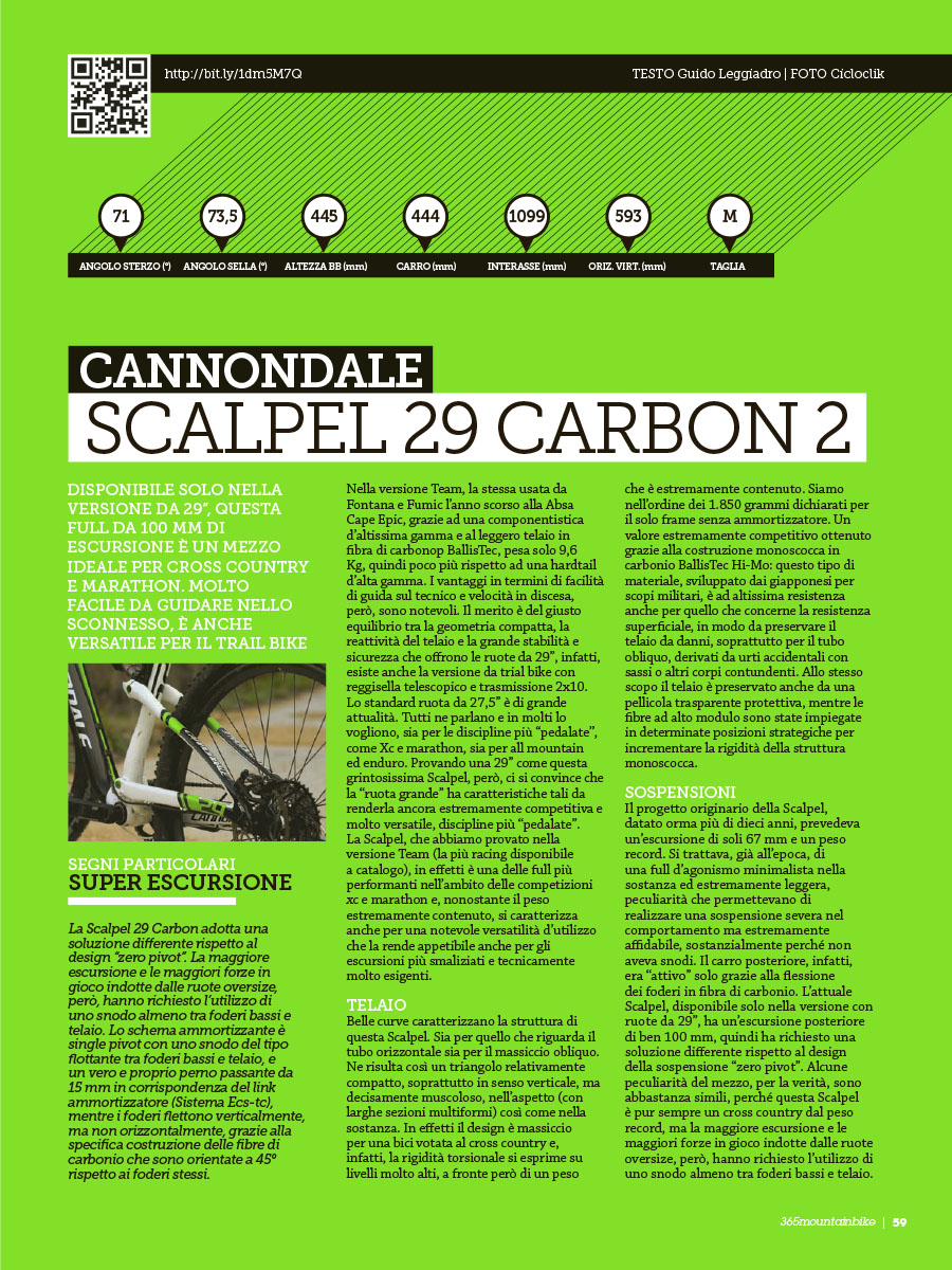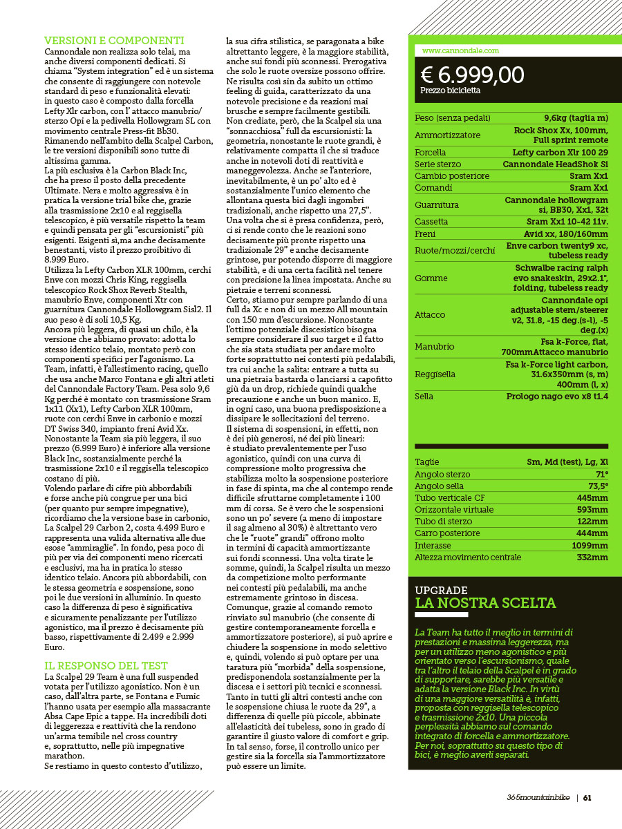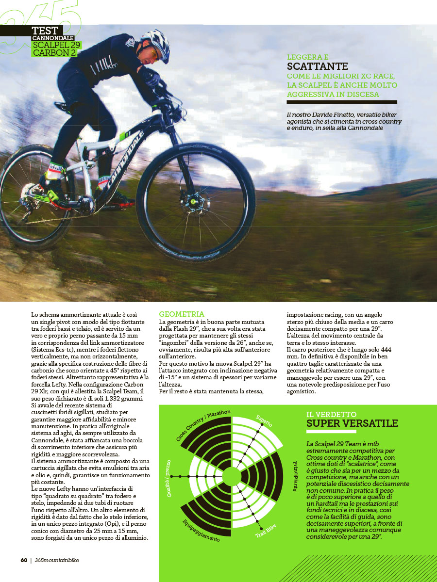 La Scalpel 29″ Team è una MTB estremamente competitiva per il Cross Country e le Marathon, con ottime doti di scalatrice, come è giusto che sia per un mezzo da competizione, ma anche con un potenziale discesistico decisamente non comune. In pratica il peso è di poco superiore a quello di un hardtail ma le prestazione sui fondi tecnici e in discesa, così come la facilità di guida, sono decisamente superiore, a fronte di una maneggevolezza comunque considerevole per una 29″.