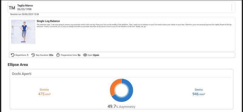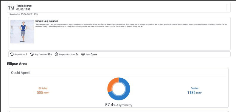 Per la stabilità ho condotto un test della durata di 30 secondi, sia a occhi aperti che chiusi, in modalità monopodalica. Successivamente, ho ripetuto le stesse prove applicando i nastri Omstrip sui muscoli tibiali anteriori e sui paravertebrali, rispettando un intervallo di 30 minuti tra le due serie di test.